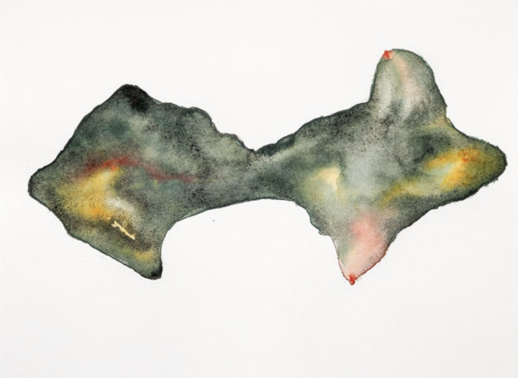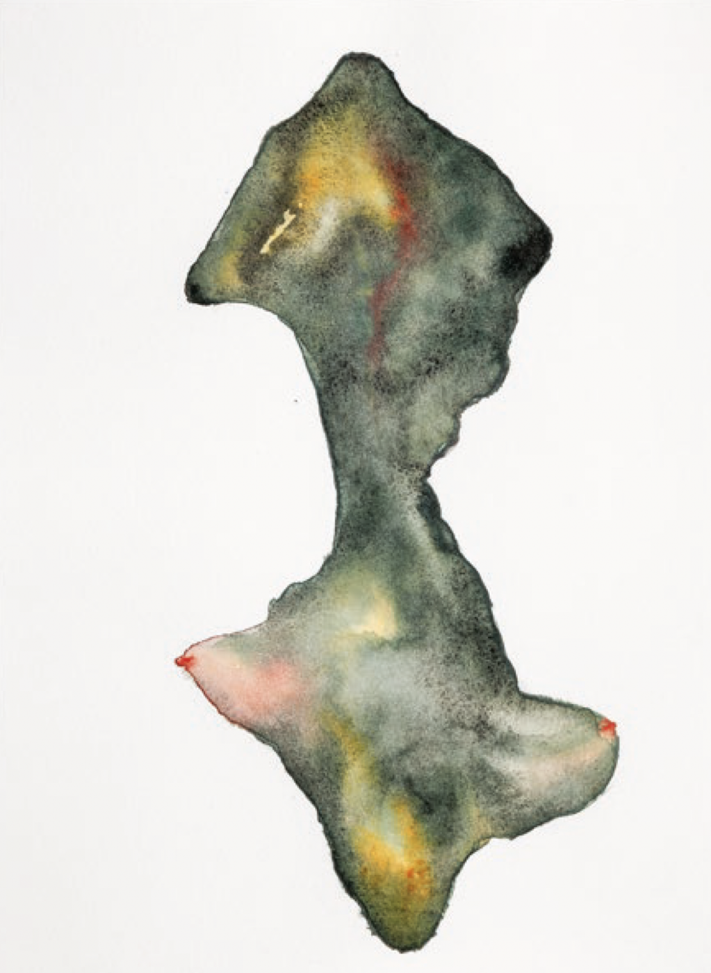 Das Aquarell aus der Serie Voice of Many Stones entstand unter Selbsthypnose mit einem einzigen Farbauftrag. Die entstandene archaisch anthropomorphe Steinformation verweist auf die Darstellung von Muttergöttinen.