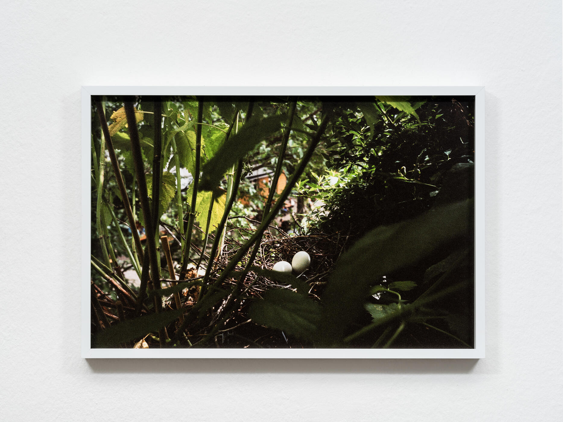 Die Jahresgabe Nest (I) zeigt den Nistplatz eines Vogels im urbanen Raum. Zwischen den Zweigen einer Balkonpflanze geschützt, liegen zwei Eier. Der Balkon erscheint als Schwellenraum zwischen Innen und Außen; das Ei als Membran, in der sich dieser Übergang innerhalb unserer geteilten Umwelt leise verdichtet.