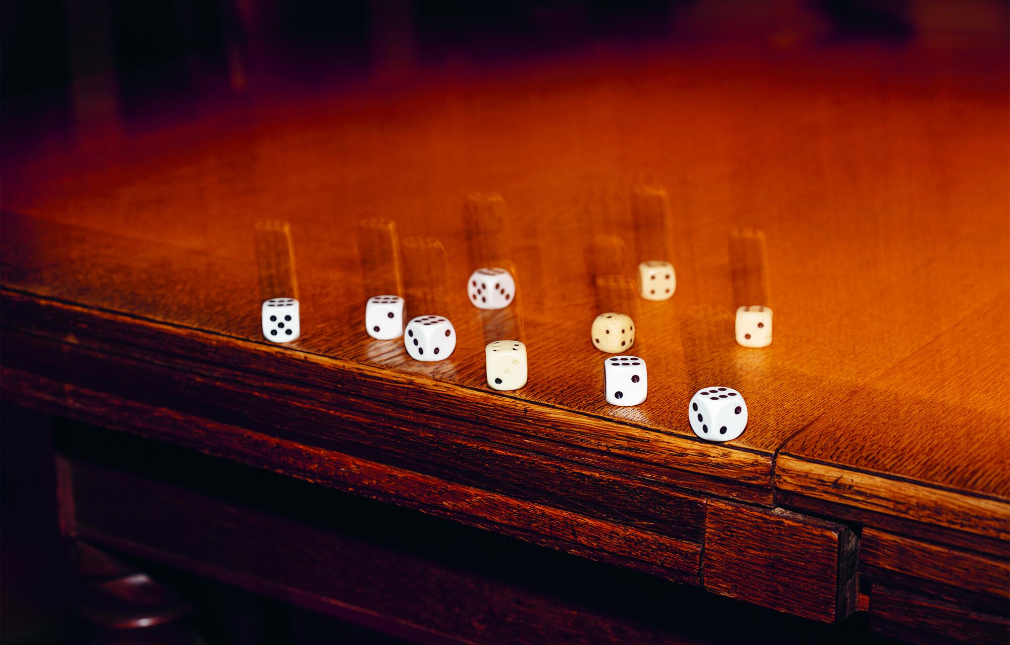 Die Fotografie One Hundred and Thirty-Six zeigt eine Gruppe Würfel und Bewegungsspuren, die durch Langzeitbelichtung, Kamerabewegung und mehrere aufeinanderfolgende Blitze entstanden sind. Durch den Moment, in dem die Fotografie aufgenommen wurde, hat sich die Perspektive multipliziert. Die Würfel sind in Bewegung, während das Bild ein Wurfergebnis festhält.