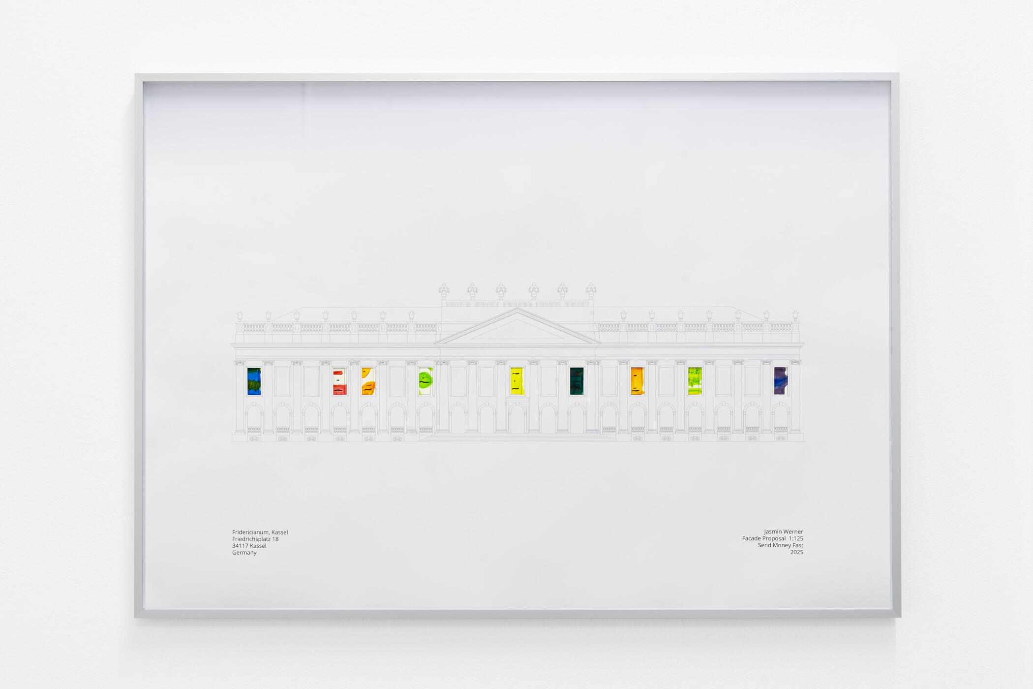 Send Money Fast (Proposals) war als Teil von Jasmin Werners Ausstellung The Structure of Claim 2025 in den Posterrahmen im Außenraum der GAK zu sehen. Jede der drei als Jahresgabe für die GAK zur Verfügung gestellten Arbeiten besteht aus zwei Architekturzeichnungen, die Museumsfassade und Fensterdetail zeigen und durch ausgeschnittene Flächen die darunter liegenden Malereien offenlegen. In ihrer Überlagerung machen sie sichtbar wie eng Macht, Besitz und Erinnerung mit ökonomischen Strukturen verflochten sind – und laden dazu ein, die Fassaden kultureller Institutionen als Spiegel gesellschaftlicher Realitäten zu lesen.