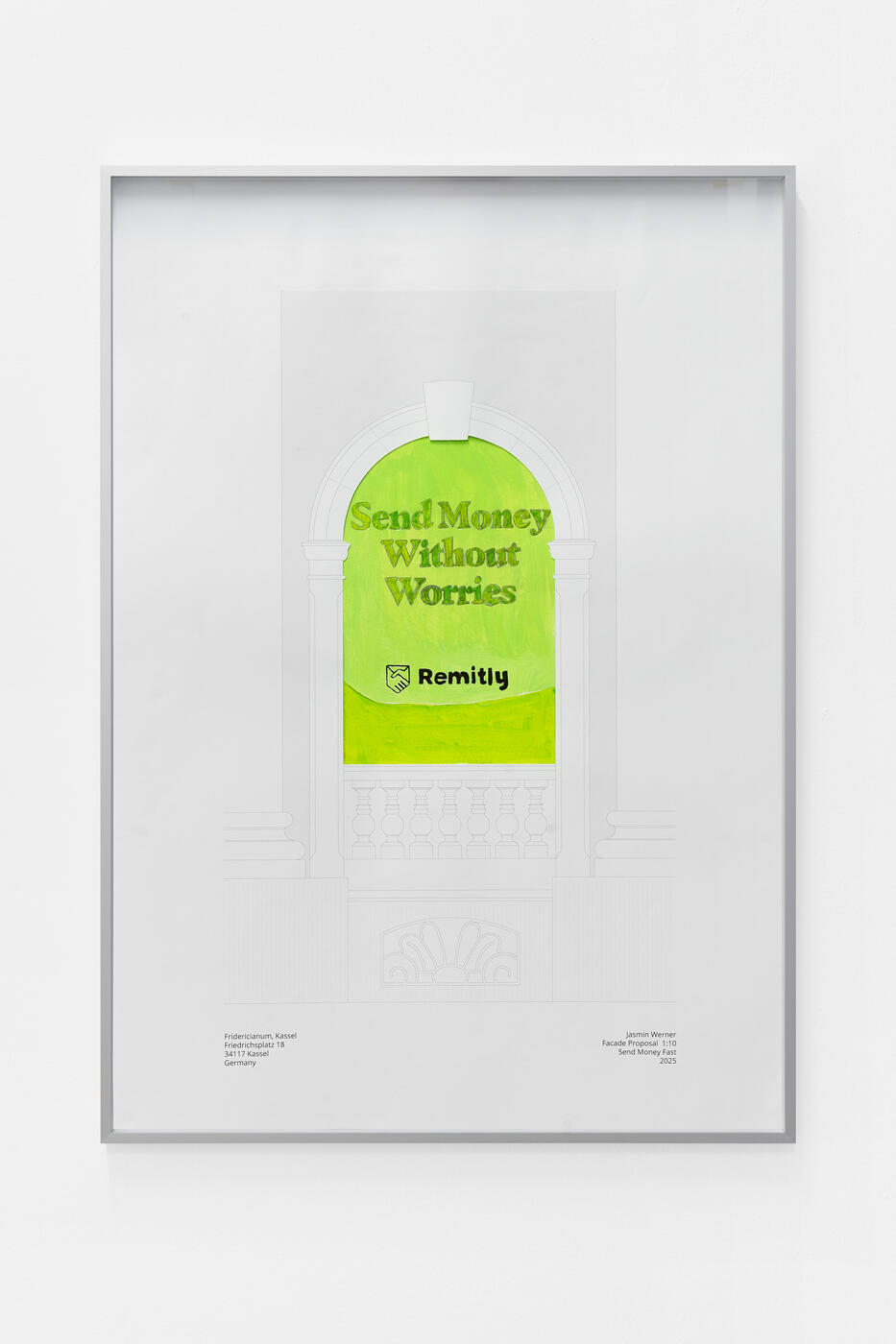 Jasmin Werners Serie Send Money Fast (Proposals) bringt zwei Welten zusammen, die im Alltag selten aufeinandertreffen: die großen, strahlenden Institutionen der Kunst und Geschichte und die kleinen, oft übersehenen Remittance-Shops, in denen Menschen Geld in ihre Herkunftsländer schicken. Indem Werner in die Fenster bestehender Museumsfassaden von Kapstadt bis Bremen handgemalte Rollos integriert, die Werbung für Geldtransferdienste wie MoneyGram tragen, verknüpft Werner koloniale Vergangenheit, globale Finanzströme und diasporische Gegenwart zu einem Bild.