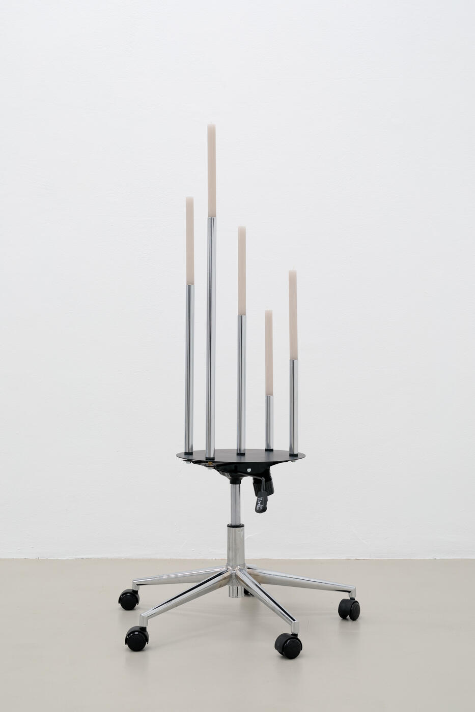 Die Grenze zwischen Design und Kunst wird häufig entlang möglicher Funktionalitäten gezogen, wobei das Designobjekt als zweckgebunden gilt. In ihrer künstlerischen Praxis spielt Isabelle Enders mit diesen Zuordnungen, indem sie Arbeiten entwickelt, in denen der angenommene Nutzen bewusst überbetont wird, wodurch neue formale Lösungen entstehen. Mit ihrer speziell für den Kunstverein Nürnberg – Albrecht Dürer Gesellschaft entwickelten Jahresgabe „office” führt Enders verschiedene (soziale) Momente und Realitäten aus dem Jahreskalender (eines Kunstvereins) zusammen. Elemente eines klassischen Bürointerieurs, die bereits ihre erste „Bar“ im Kunstverein prägten, lässt Enders mit der Silhouette eines Kerzenleuchters verschmelzen, wodurch eine feierliche Winterstimmung anklingt.