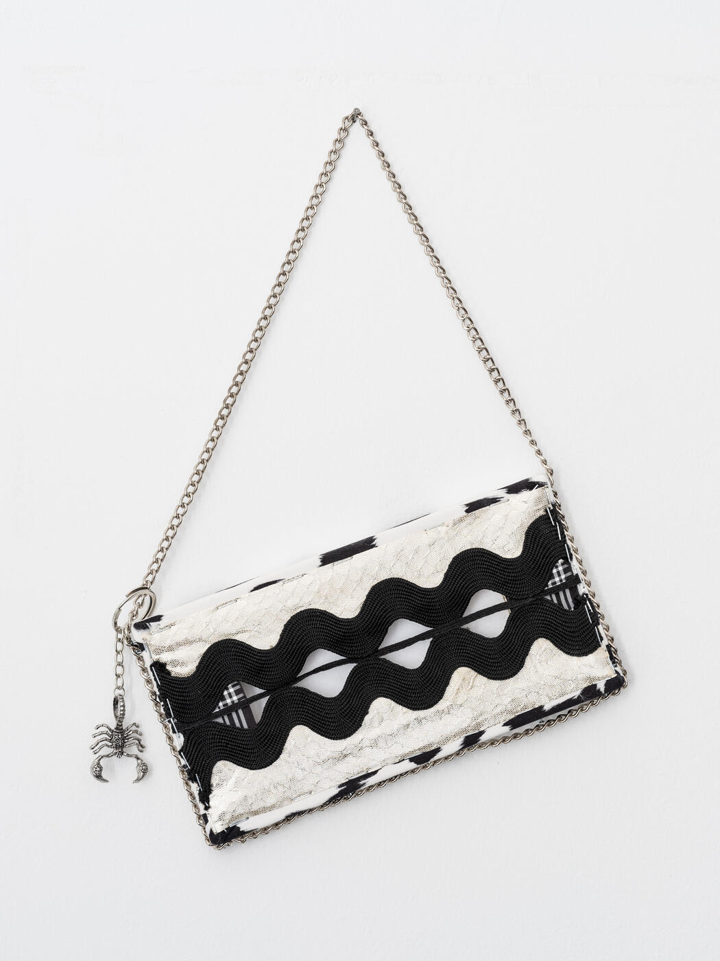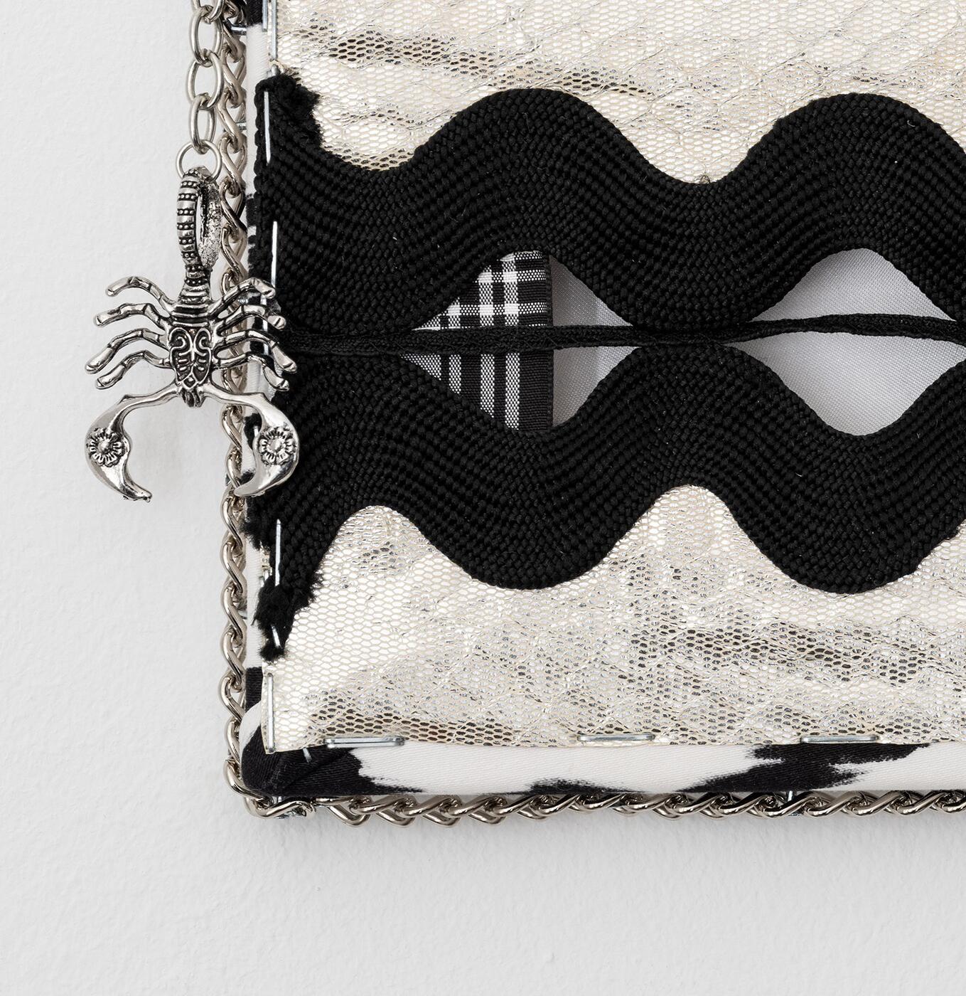Und doch funktionieren die Talismane anders: Sie begleiten die Künstlerin auf ihren Reisen und laden sich so mit persönlichen Eindrücken neuer Orte und Erfahrungen auf. In ihnen sammeln sich Emotionen, Gesehenes und Erlebtes mit der Frage nachdem, was möglicherweise – auch als Herausforderung – kommt. Formal funktioniert die Arbeit in Anlehnung an eine Tarotkarte, bei der Erscheinung als modisches Objekt einer Tasche.